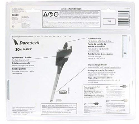Bosch DareDevil Spade Bits offer the industry's leading performance over any other spade bit available today. The DareDevil was designed to answer the needs of professional users in terms of speed, ease of use and hole quality. The DareDevil is the fastest spade bit in the industry, provides smooth and effortless drilling, and produces the cleanest hole. A first for Spades, the full cone threaded tip provides the speed needed to drill faster and it pulls the bit through the material with less effort and vibration than other spade bits.