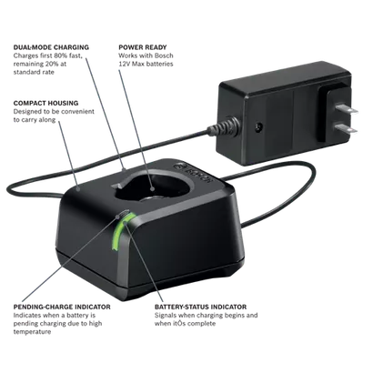 - Advanced 12V Max charger design – built to get users power ready in a hurry, featuring 80/20 dual-mode charging, indicator lights and full compatibility with Bosch 12V Max Lithium-ion batteries