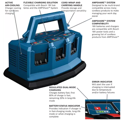 - 6-bay charging convenience – allows users to sequentially charge six Bosch 18V batteries