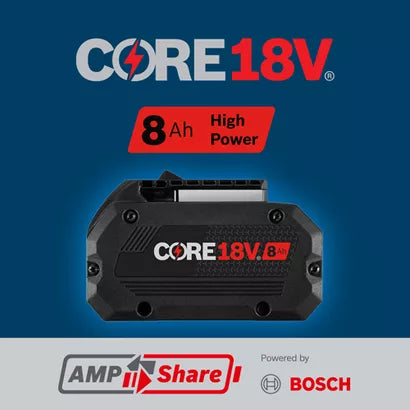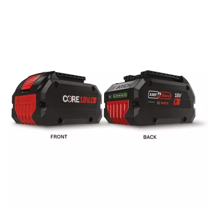 This 2 Pack features two Bosch CORE18V® 8 Ah High Power Batteries, which each deliver 50% more runtime and over 75% more power than the CORE18V® 4 Ah battery, powering high-demand applications. The GBA18V80 features two layers of enhanced 21700 cells for greater battery efficiency. The battery has Bosch-exclusive CoolPack™ 2.0 technology, which cools the battery faster and helps provide longer lifetime compared to Bosch 18V batteries without CoolPack™ 2.0. With its cutting-edge battery design – including copper end plates, power rails and a flexible circuit board – it offers reduced resistance and increased efficiency. It weighs only 2.14 Lbs., for the ideal balance of size, weight and power. It includes a charge-status Indicator with high resolution for clear visibility. This battery is engineered for 18V, and it's compatible with Bosch 18V tools. The GBA18V80 is optimized to drive Bosch PROFACTOR™ tools with BITURBO Brushless™ Technology, for power comparable to the most demanding corded tools. The battery is compatible with Bosch 18V chargers and the AMPShare™ System. The AMPShare™ System is a battery system designed to be multi-brand compatible across many cordless products to make managing your work day easier.