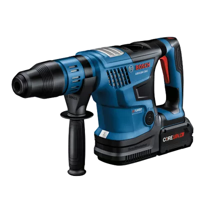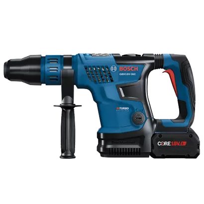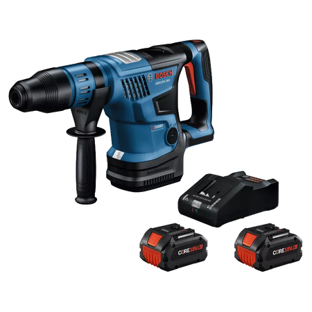 This 18V SDS-max® 1-9/16 In. rotary hammer is powerful enough to provide corded-type performance for tackling heavy-duty concrete drilling or chiseling jobs. The Bosch GBH18V-36C Rotary Hammer delivers 5.2 Ft.-Lbs. of impact energy (EPTA). That is unprecedented for a single 18V battery-driven SDS-max® 1-9/16 In. rotary hammer. It weighs 13.4 Lbs. (with included battery). This hammer is part of the PROFACTOR™ System, which pairs BITURBO Brushless™ Technology with a CORE18V® High Power Battery. BITURBO Brushless™ Technology is a high-performance motor and drive-train system designed to deliver power comparable to high-demand corded tools. The anti-vibration system features a longer air cushion in the hammer tube and dampeners in the handle The hammer has KickBack Control, rotary hammer and hammer-only modes, a reverse setting and Vario-Lock to rotate and lock the chisel. The hammer features an on-tool user interface for tool performance, feedback and control. This hammer features connectivity (module sold separately), providing a link to the free Bosch Toolbox app on a connected device to customize settings. The kit includes two CORE18V® 8 Ah High Power Batteries, which each deliver 50% more runtime and over 75% more power than the CORE18V® 4 Ah battery, powering high-demand applications. The kit has a battery turbo charger, which provides 16-amp charging current for fast and faster charging, with an optional Power Boost™ mode.