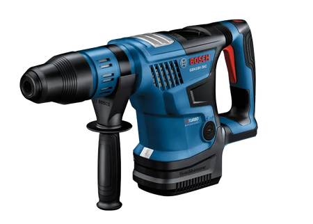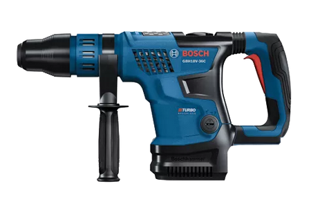 This 18V SDS-max® 1-9/16 In. rotary hammer is powerful enough to provide corded-type performance for tackling heavy-duty concrete drilling or chiseling jobs. The Bosch GBH18V-36C Rotary Hammer delivers 5.2 Ft.-Lbs. of impact energy (EPTA). That is unprecedented for a single 18V battery-driven SDS-max® 1-9/16 In. rotary hammer. It weighs 11.3 Lbs. (tool only, not including battery). This hammer is part of the PROFACTOR™ System, which pairs BITURBO Brushless™ Technology with a CORE18V® High Power Battery. BITURBO Brushless™ Technology is a high-performance motor and drive-train system designed to deliver power comparable to high-demand corded tools. The hammer has KickBack Control to reduce the risk of sudden tool reactions in binding conditions, and it includes an anti-vibration main handle. The GBH18V-36C has rotary hammer and hammer-only modes, a reverse setting and Vario-Lock to rotate and lock the chisel. It also has Soft Start and controlled rpm and bpm, making it easier to control drilling and chiseling applications. The hammer features an on-tool user interface for tool performance, feedback and control. This hammer features connectivity (module sold separately), providing a link to the free Bosch Toolbox app on a connected device to customize settings.