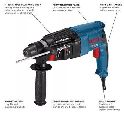 The Bosch GBH2-26 1 In. SDS-plus® Bulldog™ Xtreme Rotary Hammer is a durable and powerful 8.0 Amp rotary hammer. Another of the notable Bosch Bulldog™ hammers, this powerful and versatile tool combines user comfort with versatile drilling and hammering functions. Ideal for masonry pros or general contractors, this tool weighs only 6.4 Lbs., but it has an upgraded 8.0 Amp motor that provides 2.0 Ft.-Lbs. of impact energy and 0-5,100 BPM. It has a multifunction mode selector for drilling versatility – drilling only, hammer drilling and chiseling. With a rotating brush plate for longer brush life, this hammer provides a variable-speed reversing trigger for accurate bit starting. The SDS-plus® system provides for tool-free bit changes with automatic bit locking. The tool has a Vario-Lock positioning system that allows the user to rotate a chisel into the optimal chiseling angle. An ergonomic pistol-grip handle provides comfort in hard-to-reach places or all-day tasks.