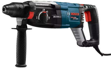 The Bosch GBH2-28L SDS-plus® Bulldog™ Xtreme Max 1-1/8 In. Rotary Hammer features a powerful 8.5 Amp motor and KickBack Control. This feature is an integrated sensor to stop tool rotation during bit bind-up situations. A tool that upholds the tradition in the line of legendary Bosch Bulldog hammers, the GBH2-28L combines user comfort with versatile drilling and hammering functions. It provides counter-balanced Vibration Control for more comfortable handling of the hammer. Ideal for masonry pros or general contractors, this tool weighs only 6.9 Lbs. but delivers 2.4 Ft.-Lbs. of impact energy and 0-5,100 BPM. It has a multifunction mode selector for drilling versatility – drilling only, hammer drilling and chiseling. This Bulldog has ideal features for hard-working pros, including a variable-speed reversing trigger for accurate bit starting, Vario-Lock positioning for the optimal chiseling angle, a HammerHook that allows the user to hang the tool on the job and an ergonomic D-handle for user comfort. The SDS-plus® system provides for tool-free bit changes.