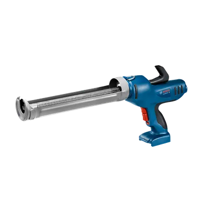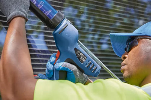 The Bosch GCG18V-29 18V Caulk and Adhesive Gun provides powered caulking to reduce the fatigue on your hand from manual caulk and adhesive guns. It has speed selection and a variable-speed trigger for a consistent bead size and easier caulk application. The caulk and adhesive gun features an auto-reverse feature on the plunger rod to help prevent dripping and material overflow. It holds 29 oz. tubes and delivers a no-load max of 18 In. per minute feed and 790 Lbs. of push force, to push even high-viscosity adhesives including anchor adhesives in concrete. The cage rotates, so that material can be applied in difficult areas while still keeping your preferred hand location. And it’s light – only 5 Lbs. (tool only, not including battery). It is compatible with Bosch 18V Lithium-ion batteries, and it fits 29 oz. tubes. The caulk gun has a hook for hanging between jobs and a lockout switch, so the trigger won’t be accidentally activated.