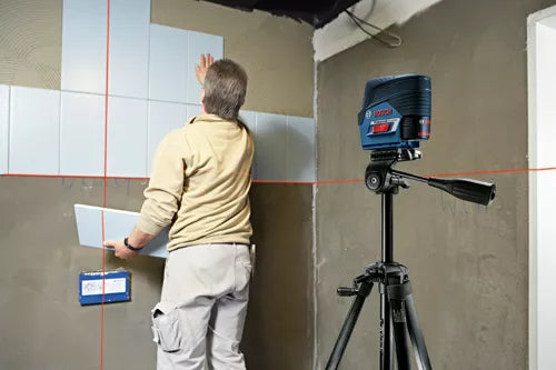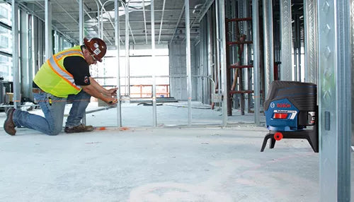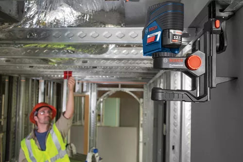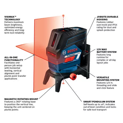 The Bosch GCL100-80C 12V Max Connected Cross-Line Laser with Plumb Points delivers all-in-one versatility, with highly visible lines and points. They provide horizontal level, vertical alignment and plumb point transfer applications. The tool features Bosch-exclusive VisiMax™ technology, which monitors tool temperature and power consumption to deliver the brightest line for the job. The laser features Bosch 12V Max Lithium-ion power for extended laser runtime during complex or all day layout jobs, provides a visible range of 100 Ft. and can work with an optional Bosch laser receiver to extend that range to 165 Ft. The Smart Pendulum System self-levels up to ±4°, indicates out-of-level condition and locks for safe tool transport. The manual mode locks lines for use at any angle. The laser comes with the RM 2 Magnetic Rotating Mount that rotates 360°, has a micro-fine adjustment knob and includes a ceiling grid clip.