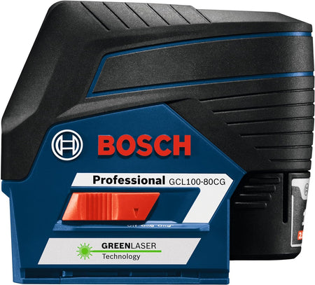 The Bosch GCL100-80CG 12V Max Green-Beam Connected Cross-Line Laser with Plumb Points delivers all-in-one versatility, with highly visible lines and points. They provide horizontal level, vertical alignment and plumb point transfer applications. The tool features Bosch-exclusive VisiMax™ technology, which monitors tool temperature and power consumption to deliver the brightest line for the job. The laser projects visible green lines up to 100 Ft., which are up to 4X brighter than standard red beams. The laser features Bosch 12V Max Lithium-ion power for extended laser runtime during complex or all day layout jobs, provides a visible range of 100 Ft. and can work with an optional Bosch laser receiver to extend that range to 165 Ft. The Smart Pendulum System self-levels up to ±4°, indicates out-of-level condition and locks for safe tool transport. The manual mode locks lines for use at any angle. The laser comes with the RM 2 Magnetic Rotating Mount that rotates 360°, has a micro-fine adjustment knob and includes a ceiling grid clip.