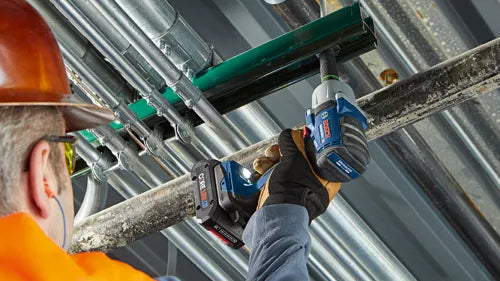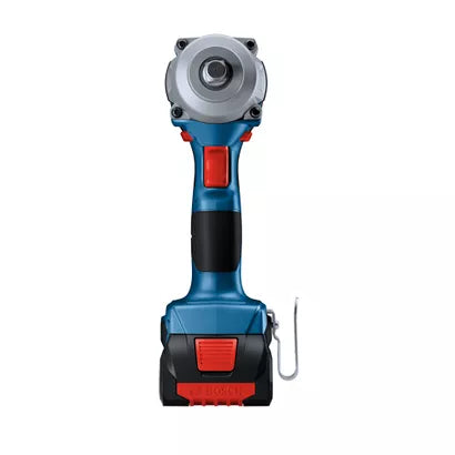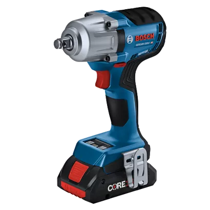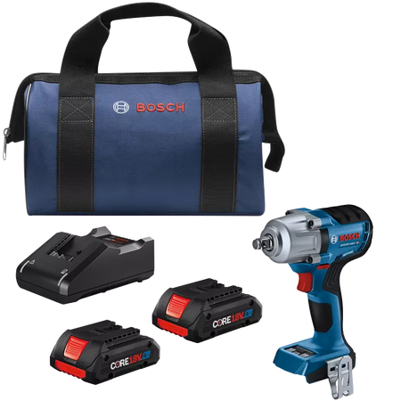 The Bosch GDS18V-330C 18V Brushless 1/2 In. Mid-Torque Impact Wrench delivers outstanding performance, whether driving lag bolts through heavy lumber, assembling metal structure, or removing stubborn lug nuts. This impact wrench has a 1/2 In. drive with a friction ring and thru-hole for quick socket changes and secure attachment. The brushless motor delivers up to 330 Ft.-Lbs. fastening torque and 590 Ft.-Lbs. breakaway torque while providing long runtime. Modes such as Auto Stop help prevent over driving, which can damage materials and fasteners. Presets for specific bolts, screws and materials can be customized and saved to the tool via the Bosch Toolbox App (connectivity module sold separately). When reversing in bolt mode, Auto Bolt Release senses when the bolt is loosened and stops rotation to help prevent accidental dropping of bolts and nuts during removal. In addition to customizable settings and modes, connectivity (module sold separately), provides tool specific information and feedback. The kit features two CORE18V® 4 Ah Advanced Power Batteries, which deliver 2x the runtime compared to previous generation BAT612 2.0 Ah battery.