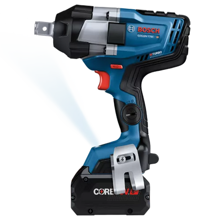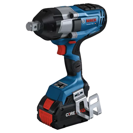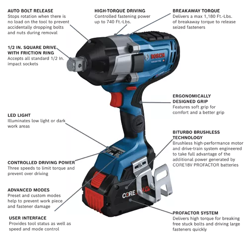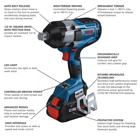 The Bosch PROFACTOR™ GDS18V-770C 18V Connected 3/4 In. Impact Wrench with Friction Ring and Thru-Hole is designed for breaking free and driving large bolts, nuts and anchors quickly. It is part of the PROFACTOR™ System, which pairs BITURBO Brushless™ Technology with a CORE18V® High Power Battery. BITURBO Brushless™ Technology is a high-performance motor and drive-train system designed to deliver power comparable to high-demand corded tools. The tool delivers up to 770 Ft.-Lbs. fastening torque and 1,250 Ft.-Lbs. breakaway torque, while maintaining long runtime. In addition to three speed/torque settings this impact wrench also features special modes to help prevent workpiece and fastener damage. The presets include modes for metal screws and wood lag screws. Additional modes and customizations for specific screws and materials can be set and saved to the tool via the Bosch Toolbox App (connectivity module included). In reverse, with bolt mode activated, the Auto Bolt Release stops rotation when there is no load on the tool to help prevent accidentally dropping bolts and nuts during removal. In addition to customizing settings and modes, connectivity (connectivity module included), provides tool specific information and feedback. The variable-speed trigger provides accurate driving speed. It also has an LED light system to illuminate the work area. The wrench features a rubber head casing that helps protect workpiece and tool from damage. The kit includes a CORE18V® 8 Ah High Power Battery, which delivers 50% more runtime and over 75% more power than the CORE18V® 4 Ah battery, powering high-demand applications.