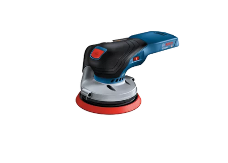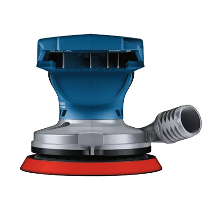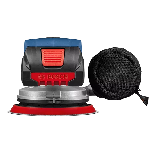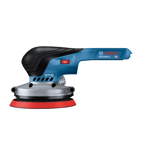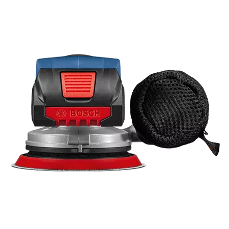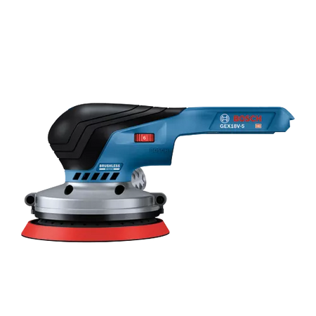 This 18V random orbit sander features a well-balanced ergonomic palm grip, which allows your hand to be closest to the work material to avoid tilting and pressing down, for best results. The easy-to-reach on/off switch offers intuitive operation. It has a vibration dampening element to help minimize user fatigue. The Bosch GEX18V-5 Brushless 5 In. Random Orbit Sander has a powerful 18V brushless motor, which delivers similar stock removal to a corded sander. The speed selector delivers best results in different materials and applications. The sander has a 5 In. 8-hole sanding pad, which provides optimal dust collection when the sander is attached to a vacuum or a dust bag. The dust pad is ideal for both flat and concave/convex surfaces. The included dust bag allows mobile dust collection, while the tool has an interface for vacuum hose attachment. The sander has a compact shape with close-to-the-workpiece design for control in hard-to-reach areas. It also has soft-start technology, constant speed and a hook-and-loop backing pad.