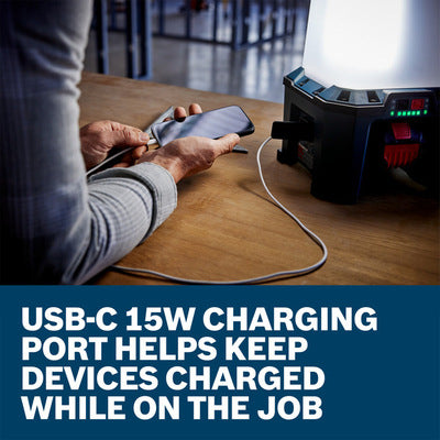 The Bosch GLA18VH-7500 18V Hybrid Area Light delivers powerful illumination for a clearer view in large, poorly lit work areas. With three brightness modes: low (2500 lumens), medium (5000 lumens) and high (7500 lumens) the light is adaptable to the task at hand. Get full coverage lighting with brightness ramp up with the 360-degree setting or utilize the 180-degree right or left range modes for a more focused output. All settings can be controlled via the convenient user interface that also features a battery status indicator. Fully compatible with the Bosch 18V battery platform, the area light can also be used with 120V AC power source for added versatility. Engineered for task, area and overhead applications, the light features a self-centering mounting hook, non-threaded, quick mount tripod hole and 5/8” threaded tripod mounting hole for easy positioning, making it adaptable to a range of work sites. The integrated 15W USB-C charging port will help keep mobile devices and measuring tools powered up while on the job.