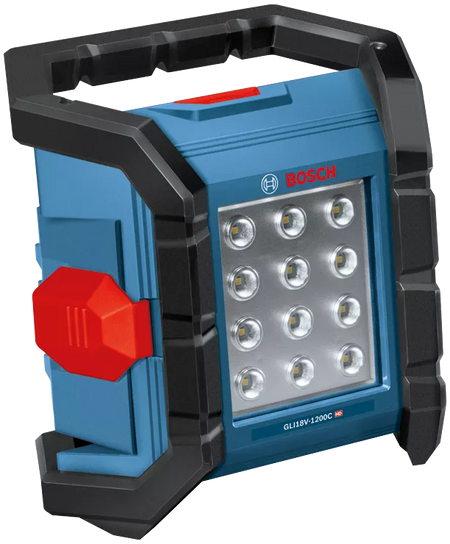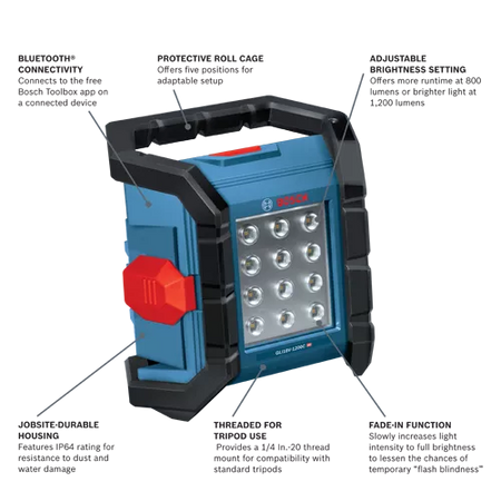 This robust 18V floodlight features a protective roll cage, an IP64-rated cover resistant to dust and water damage, Bluetooth® connectivity and outstanding runtime. The Bosch GLI18V-1200C is a connected, high-powered floodlight. It adds the convenience of connectivity to a mobile device to control the light, so users can work smarter. The Toolbox App connects to the light from up to 100 Ft. away with Bluetooth®, to control the floodlight's operation. Users can turn the light on and off remotely. They can dim the light, set it on a timer, check the battery status and control groups of lights via a mobile device. The 1,200 lumen floodlight provides light for work areas and has a fade-in function. It delivers long runtime provided by rechargeable Bosch 18V batteries (not included). It has an 800-lumen dimmed mode for longer runtime, up to 17 hours on a CORE18V 8.0 Ah battery. The portable, compact light has a protective roll cage for versatile positioning and a 1/4 In.-20 thread mount. This is a bare tool; the battery and charger are sold separately.