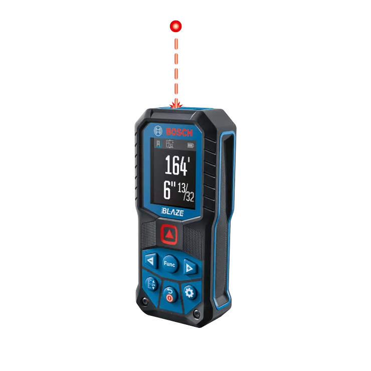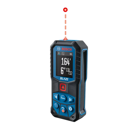 This 165 Ft. laser measure is a fully featured tool with an easy-to-read color display, great accuracy and reinforced housing for durability. The Bosch BLAZE™ GLM165-22 has accuracy up to ±1/16 In., plus it includes a rounding button that rounds the measurement to the fraction that best suits the application and haptic feedback for loud jobsites. The digital laser measure also offers full rubber overmold housing, designed to be similar to a roll cage. It is IP65 rated and has an ergonomic design for better grip. It has default real-time measurement mode, which immediately provides accurate measuring that automatically adjusts closer to or farther from the target. It includes 11 different measuring functions, including real-time length, length, area, volume and indirect functions, and addition/subtraction capability.