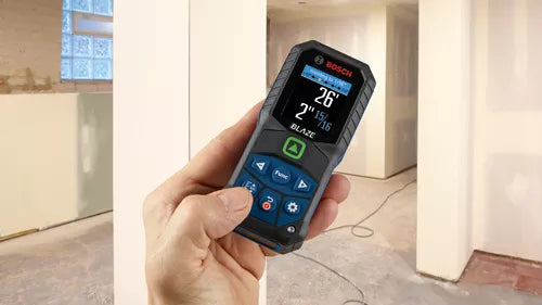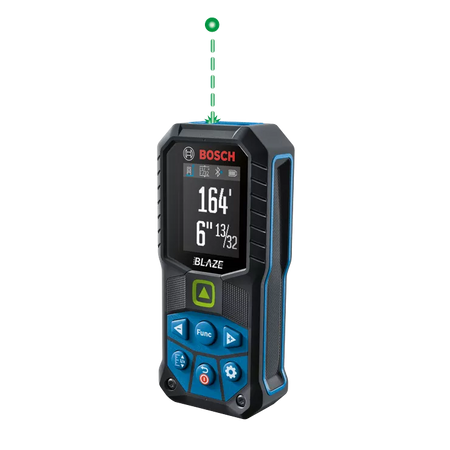 This 165 Ft. green-beam laser measure is a fully featured tool with an easy-to-read color display, great accuracy, an inclinometer for tilt angle and reinforced housing for durability. The Bosch BLAZE™ GLM165-27CG uses green-beam technology, which generates a point/dot up to 4X brighter than standard red beams. The inclinometer shows the tilt angle up to 360° for easy angle and indirect measurements. The laser has accuracy up to ±1/16 In., plus it includes a rounding button that rounds the measurement to the fraction that best suits the application and haptic feedback for loud jobsites. The digital laser measure also offers Bluetooth® functionality, so users can digitally transfer measurements to a smartphone or tablet through the free MeasureOn app. It also has full rubber overmold housing, designed to be similar to a roll cage. It is IP65 rated and has an ergonomic design for better grip. It includes 11 different measuring functions, including real-time length, length, area, volume and indirect functions, and addition/subtraction capability.