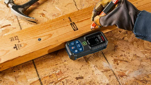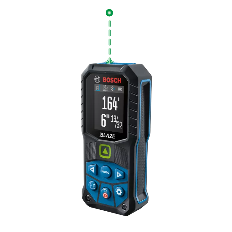 The Bosch BLAZE™ GLM165-27CGL uses green-beam technology, which generates a point/dot up to 4X brighter than standard red beams. The inclinometer shows the tilt angle up to 360° for easy angle and indirect measurements. The laser has accuracy up to ±1/16 In., plus it includes a rounding button that rounds the measurement to the fraction that best suits the application and haptic feedback for loud jobsites. The digital laser measure also offers Bluetooth® functionality, so users can digitally transfer measurements to a smartphone or tablet through the free MeasureOn app. It also has full rubber overmold housing, designed to be similar to a roll cage. It has a rechargeable Li-ion battery for extended runtime. It is IP65 rated and has an ergonomic design for better grip. It includes 11 different measuring functions, including real-time length, length, area, volume and indirect functions, and addition/subtraction capability.