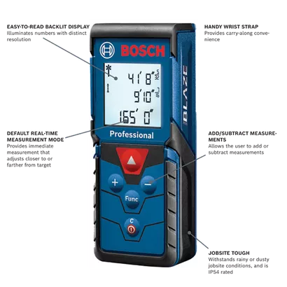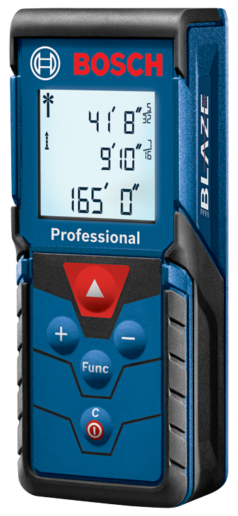 The Bosch BLAZE™ Pro GLM165-40 165 Ft. Laser Measure is a fully featured yet simple-to-use tool. It provides an easy-to-read backlit display that illuminates the measurements, and it delivers distance, square footage, volume and indirect measuring functions. It has a 10-measurement storage capability. This measure has addition/subtraction functionality, so the user can add or subtract measurements. The BLAZE™ Pro includes default real-time measurement mode, adjusting the measurement the closer to or further from the target the laser measure is. It has laser precision technology and real-time measurement mode, for instant and reliable measurements up to 165 Ft., to size up the job in seconds. It is accurate up to ±1/16 In. It fits in any pocket for easy access.