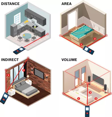 - Multiple measuring features – calculates distance, square footage, volume and indirect measurements