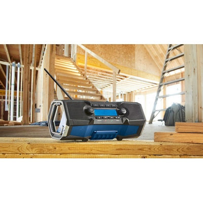 The Bosch GPB18V-2C is a portable and flexible cordless jobsite radio featuring Bluetooth® 5.0 technology. High-performance speakers featuring enhanced bass response delivers outstanding sound clarity and quality. Bluetooth® connectivity enables users to listen to their favorite music streaming service including Pandora®, Spotify® and Apple Music®, or stored songs via their mobile device (from up to 100 Ft. away). An AUX IN connection is included for MP3 players or portable satellite receivers. Additionally, the unit includes digital radio tuning with eight FM presets and four AM presets. Keeping mobile devices charged and ready is made easy with the onboard USB port. Convenient handles and hanging hook make this radio easy to carry and place on the jobsite, in a workshop, or anywhere you play. Power is provided by Bosch's 18V Lithium-ion batteries (sold separately) or the included AC/DC power adapter. It features jobsite-tough construction, and it is IP54 rated.