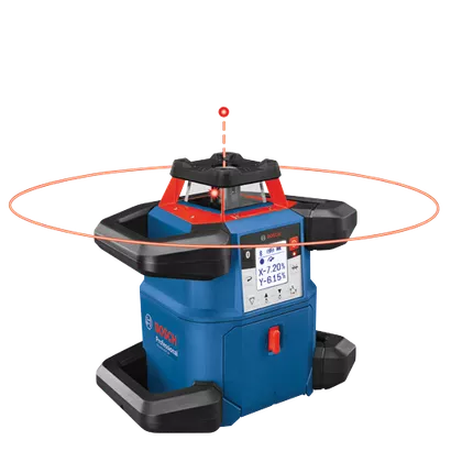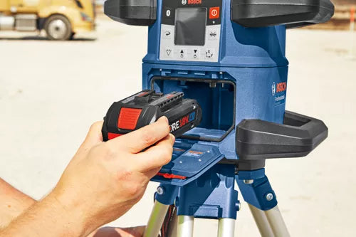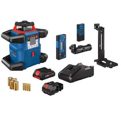 The Bosch 18V REVOLVE4000 Connected Self-Leveling Horizontal/Vertical Rotary Laser with uCAL User-calibration delivers a comprehensive solution for precise outdoor and indoor leveling. It has a Dual Dial-In Slope feature that allows slope angle adjustment on both the X and Y axes, for grading applications. The GRL4000-80CHV is powered by a Bosch CORE18V® 4 Ah battery, providing extended runtime. The rotary laser is compatible with 4 Ah and 8 Ah Bosch CORE18V® Li-ion batteries. It also features an alkaline adapter to use four (D) cells. The REVOLVE4000 is engineered with a cage overmold and an innovative handle design, and it is built to IP68 dust- and water-protection standards. It features Bluetooth® connectivity to a connected device, linking to the Bosch Leveling Remote App. This app controls on/off, Dual Dial-In Slope, and more. The rotary laser features uCAL, for user-calibration, taking the user step by step through the calibration process. This avoids tool down time and provides confidence that the laser is accurate. It delivers accuracy of up to ±1/16 In. at 100 Ft. in horizontal applications and ±1/8 In. at 100 Ft. in vertical mode, and a range of up to 4,000 Ft. with laser receiver. The laser features a vertical beam at 90° point for layout, squaring and plumb applications.