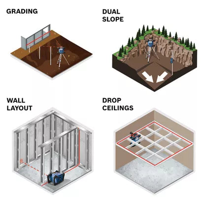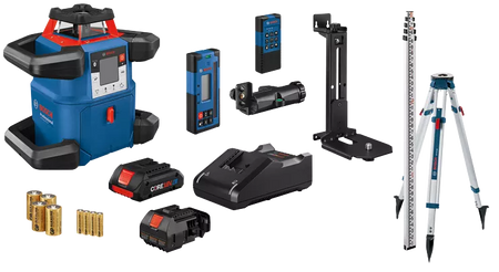 The 18V REVOLVE4000 Connected Self-Leveling Horizontal/Vertical Rotary Laser Kit with uCAL User-calibration delivers a comprehensive solution for precise outdoor and indoor leveling. It has a Dual Dial-In Slope feature that allows slope angle adjustment on both the X and Y axes, for grading applications. This laser is powered by a Bosch CORE18V® 4 Ah battery, providing extended runtime. The rotary laser is compatible with 4 Ah and 8 Ah Bosch CORE18V® Li-ion batteries. It also features an alkaline adapter to use four (D) cells. The REVOLVE4000 is engineered with a cage overmold and an innovative handle design, and it is built to IP68 dust- and water-protection standards. It features Bluetooth® connectivity to a connected device, linking to the Bosch Leveling Remote App. This app controls on/off, Dual Dial-In Slope, and more. The rotary laser features uCAL, for user-calibration, taking the user step by step through the calibration process. This avoids tool down time and provides confidence that the laser is accurate. It delivers accuracy of up to ±1/16 In. at 100 Ft. in horizontal applications and ±1/8 In. at 100 Ft. in vertical mode, and a range of up to 4,000 Ft. with laser receiver. The laser features a vertical beam at 90° point for layout, squaring and plumb applications. The comprehensive kit includes a remote control, 18V 4 Ah battery and charger, alkaline battery adapter, wall mount, laser receiver, aluminum tripod, sturdy grade rod and durable hard carrying case.