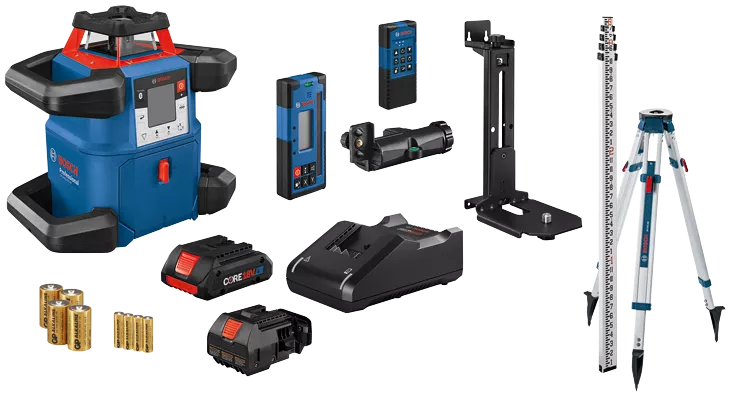 - Comprehensive kit – includes a remote control, 18V 4.Ah battery and charger, alkaline battery adapter, wall mount, laser receiver, aluminum tripod, sturdy grade rod and durable hard carrying case