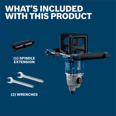 The Bosch GRW18V-160 High Torque Mixer provides the strength and torque required for tough mixing jobs. Designed for heavy-duty materials like drywall mud, stucco, mortar, thin-set, and epoxy, it features 2-speed selections, delivering speeds of 0-530 RPM and 0-720 RPM for optimal performance. Easily adjust the speed to match the task at hand using the variable speed wheel for enhanced precision. Soft start technology minimizes splashing during startup for smoother performance. KickBack Control adds protection against unexpected movement in a binding situation when mixing tough materials. The ergonomic, dual-handle design helps provide maximum control for heavy-duty mixing applications while the rear-centered battery delivers optimal balance and improved comfort. An M14 x 2.0 threaded spindle provides a secure fit for M14 mixing paddles.