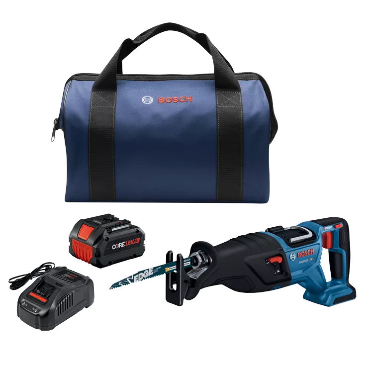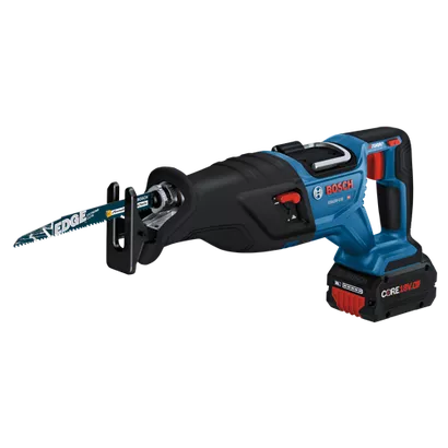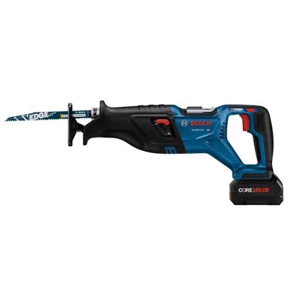 The Bosch GSA18V-110 Reciprocating Saw features a long 1-1/8 In. stroke, optimizing for more material removal in various materials, and LockJaw toolless blade-change system for quick one-handed blade insertion and spring ejection. It provides 0-2,900 spm for fast cutting, and efficient cutting in metal, wood and more while allowing close-to-the-wall cuts. This saw is part of the PROFACTOR™ System, which pairs BITURBO Brushless™ Technology with a CORE18V® High Power Battery. BITURBO Brushless™ Technology is a high-performance motor and drive-train system designed to deliver power comparable to high-demand corded tools. It offers performance comparable to Bosch 11A corded reciprocating saws. The saw has a variable-speed trigger for controllable power and speed and an orbital-mode switch for faster cutting in wood. It features an ergonomic design and vibration control for user comfort while working. The GSA18V-110 has on-tool storage for footplate depth adjustments and a pivoting footplate for flexibility while cutting. It has a rafter hook for quick hang-up on the job. The kit includes a CORE18V® 8 Ah High Power Battery, which delivers 50% more runtime and over 75% more power than the CORE18V® 4 Ah battery, powering high-demand applications.