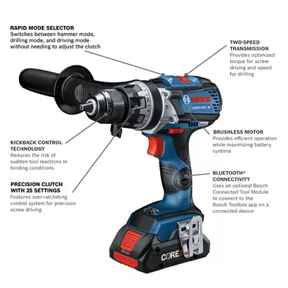This Bosch hammer drill/driver delivers next-gen innovation with power for demanding materials and applications anywhere on a jobsite. This GSB18V-975C 18V Brushless Connected-Ready 1/2 In. Hammer Drill/Driver has a powerful brushless motor, that provides efficient power for up to 975 In.-Lbs. of max torque and 0-31,500 beats per minute (bpm), but weighs only 3.4 Lbs. (tool only, not including battery). It has variable speed settings: high speed (0-2,100 rpm) and high power (0-480 rpm) and a precision clutch with 25 settings to reduce fastener damage. Rapid mode selection switches between drilling mode and driving mode without needing to adjust the clutch. The drill/driver has KickBack Control, which reduces the risk of injury from sudden rotational torque reaction in a bind-up scenario. The drill features connectivity (module sold separately), which links users to a connected device via the Bosch Toolbox App to customize settings and receive feedback. It has an all-metal chuck that provides durability and a longer belt clip for a more secure hold. The kit features two CORE18V® 4 Ah Advanced Power Batteries, allowing you to keep the power and lose the weight.