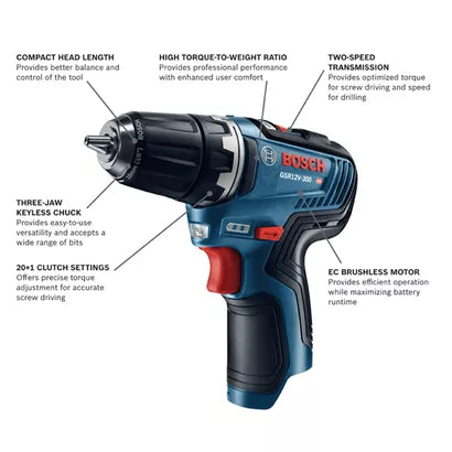 This 12V Max 3/8 In. drill/driver is a professional-grade tool that provides real power at an unreal size. The Bosch GSR12V-300 features an efficient EC Brushless motor that delivers 300 In.-Lbs. of torque, along with a max speed of 1,750 rpm. With a head length of 6.0 In. and a weight of 1.6 Lbs. (tool only, not including battery), this compact powerful drill is an ideal tool for overhead work or tight spaces. It provides two-speed transmission and 20+1 clutch settings, for more precise screwdriving. It has a durable three-jaw keyless chuck. It has an LED light to illuminate dark work areas. This is a bare tool kit; the battery and charger are sold separately.