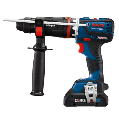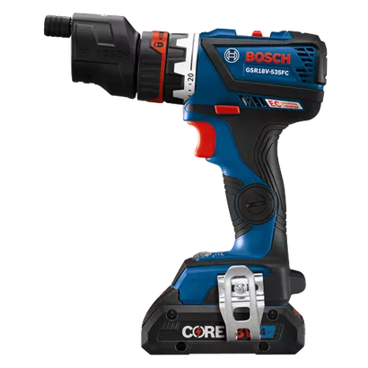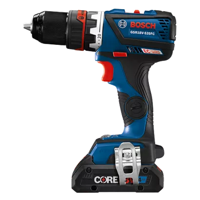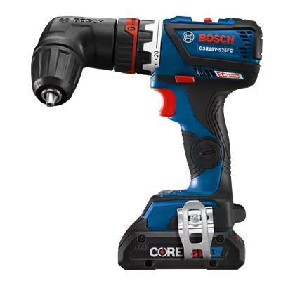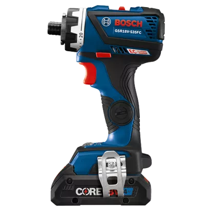 The Bosch 18V Drill/Driver is designed for professionals who are looking for a high-torque connected-ready drill/driver that redefines their limits to get the tough jobs done. is a high-torque connected-ready tool that redefines limits. The drill has a 1/4 In. hex bit holder with quick release, and the 5-In-1 Flexiclick® System includes three pro-grade attachments: a right-angle chuck, an offset hex bit holder and a 1/2 In. keyless metal chuck attachment. The GSR18V-535FCB15 18V Drill/Driver can produce up to 535 In.-Lbs. of torque. Users may also add an optional rotary hammer adapter (not included), converting the drill into an SDS-plus® rotary hammer, for drilling into masonry. The tool has a 1/4 In. hex bit holder with quick release, and the 5-In-1 Flexiclick® System includes three pro-grade attachments: a 1/2 In. right-angle chuck, an offset-angle attachment and a 1/2 In. keyless metal chuck attachment. The kit includes a CORE18V® 4 Ah Advanced Power Battery with next-gen Li-ion 21700 cell technology and an 18V charger. The drill features connectivity (module sold separately) to link to connected device via Bosch Toolbox App to customize settings and receive detailed feedback. The drill has KickBack Control, a precision clutch and an efficient brushless motor.