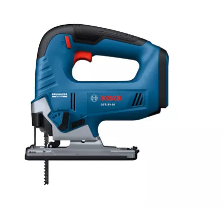 This 18V cordless jig saw is engineered for curve cuts, delivering strong and manageable power. The Bosch GST18V-50 18V Top-Handle Jig Saw provides corded performance, with a cutting capability up to 4.9 In. in wood and 0 to 3,500 strokes per minute speed. It provides a variable-speed dial allows matching the speed to material. It has a variable-speed trigger, which provides further control over the operating speed by feathering the trigger. The jig saw has four orbital-action settings for cut control. The large die-cast aluminum footplate with no-mar plastic overshoe to help prevent damage to the workpiece. It is compatible with guide rail and circle adapter. The cut lines stay visible due to the dust blower and LED light. The jig saw features a tool-free T-shank blade-change system.