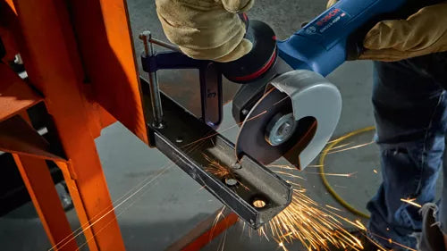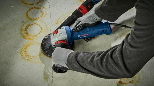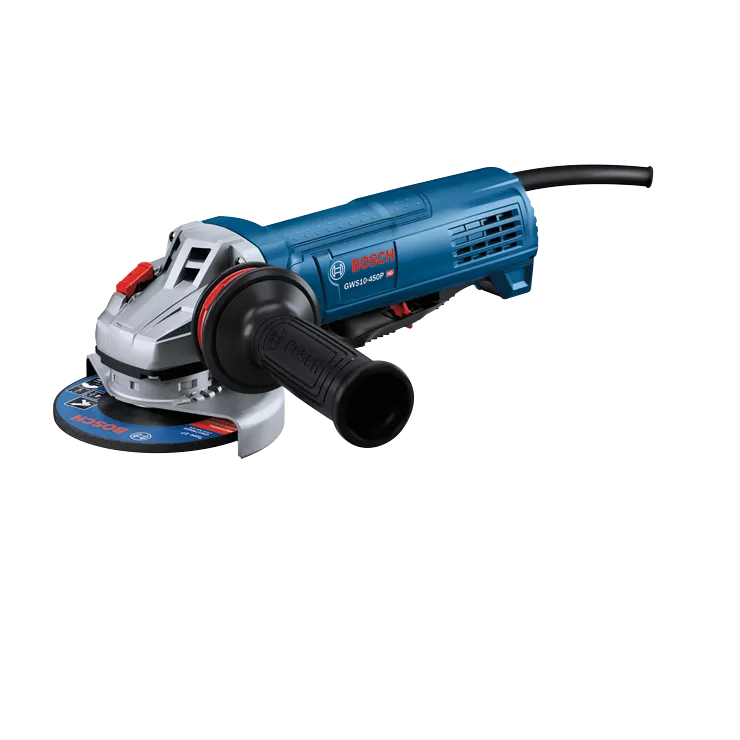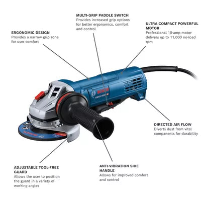 This 4-1/2 In. ergonomic angle grinder features a narrow grip zone for all-day comfort and control, combined with a powerful 10-amp motor. The Bosch GWS10-450P angle grinder delivers results, producing up to 11,000 no-load rpm for maximum productivity in grinding and cutting applications. The tool weighs 4.6 Lbs. It features a multi-grip paddle switch, which provides increased grip options for better ergonomics, comfort and control. Equipped with epoxy-coated field windings, double-sealed bearings and direct-motor cooling, this grinder is built for a longer tool life. It features spiral bevel gears for smooth transmission of power. For added convenience, it has an anti-vibration side handle and an adjustable tool-free guard with multiple fixed-adjustment settings to allow the user to position the guard in a variety of working angles. It has an updated gearhead mounting collar, which is now compatible with all Bosch metal and concrete guards.