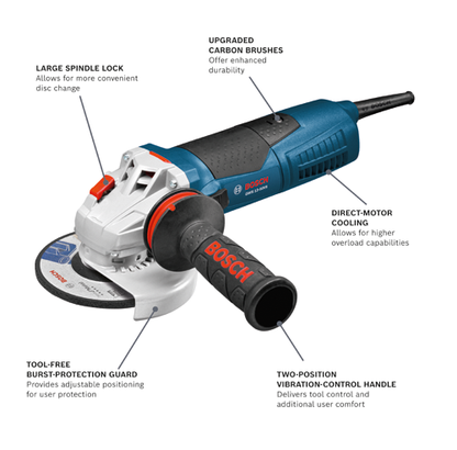 The Bosch GWS13-50VS 5- In. Angle Grinder delivers more power than previous-generation models with the same size tool – 13 amps and up to 11,500 RPM. The lower variable-speed setting – 2,800 RPM – allows the operator to match speed to application. For operator comfort and control, it sports a two-position Vibration Control side handle, making it less demanding to run. The grinder has constant electronics for easy starts, level operation and dependable speed under load. For user security, it an integrated acceleration sensor to limit inadvertent recoil and restart protection to protect against unintended startup. It has a burst-protection quick toolless adjustable guard and a large spindle lock for more convenient disc change. It was designed with directed air flow to divert dust from vital components, direct-motor cooling and Service Minderbrushes that stop the grinder when preventative maintenance is required – which promote longer tool life.