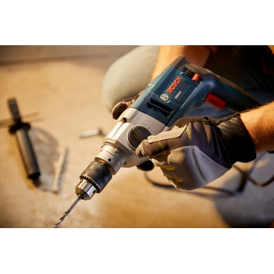 The Bosch HD18-2 Two-Speed Hammer Drill features a muscular 8.5 Amp motor that handles all masonry drilling applications, delivering a max of 51,000 BPM for muscle and durability. The tool's drilling capacities range from 3/4- In. for masonry applications to 1-1/2- In. for wood. The HD18-2 features a torque-control auxiliary handle, which locks into place; the handle has a built In. depth gauge. The dual-mode selector easily converts from rotation-only to hammer-drill mode. A rotating brush plate allows users to easily back out bound-up bits. It has two speed settings, one for high speed and one for high torque. Because of its heavy-duty three-jaw 1/2- In. chuck, the tool has a high clamping force that helps prevent drill bits from slipping. This robust drill has a metal front housing for longer life, a pistol-grip handle with soft-grip design and an integral slip clutch for security against recoil.