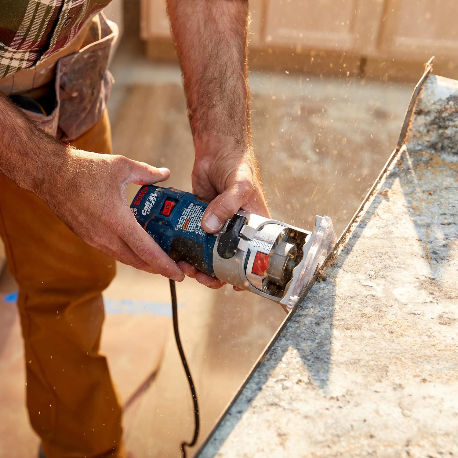 The Bosch PR20EVS Colt electronic variable-speed palm router combines power, precision and versatility in a small-sized tool. It has a 1.0 HP, 5.6 Amp motor that spins at a variable speed of 16,000 to 35,000 RPM. The variable speed dial is conveniently mounted on top of the tool body. The router features Constant Response circuitry, which maintains a consistent speed by detecting heavy loads and increasing power to maintain the selected RPM. It features soft-start circuitry, which reduces startup torque. Additionally, depth adjustment is simple; just align and lower the motor and then lock the router in position with the clamping level. Micro-fine adjustments are equally effortless, thanks to the wheel on the back of the router's base. It accepts standard 1/4 In. bits for flexibility, with an impressive max cutter diameter of 1-5/16 In. The motor housing has a palm-shaped, rubber over-molded grip that allows for comfortable operation. And the included rugged aluminum fixed base is durable, solid and precise.
