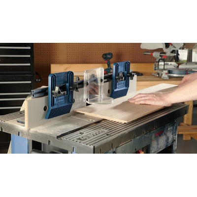 The Bosch RA1181 benchtop router table provides a large work surface for precision and versatility. The large aluminum top makes the table both durable and portable. Designed to fit a variety of routers, this router table is a versatile piece of equipment that will serve as an indispensable part of any woodworking shop. Its rigid aluminum router mounting plate is pre-drilled for compatibility with a variety of routers and for above table height adjustment with many common routers. Its 2-1/2 In. dust-collection port offers better dust collection for a cleaner work environment. This benchtop router table includes mounting hardware, features a tall aluminum fence with adjustable MDF faceplates, two outfeed shims, and an aluminum router mounting plate. The starter pin and guard for routing curved workpieces is also included, in addition to the built-in cord wrap for convenient storage and portability.