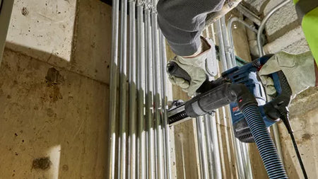 The Bosch RH328VC SDS-plus® 1-1/8 In. Rotary Hammer can deliver 2.4 Ft.-Lbs. of impact energy, but this tool weighs only 7.7 Lbs. and is a compact length of 12.5 In., for an outstanding power-to-size ratio. The 8.0-amp motor generates up to 4,000 blows per minute, making it an ideal choice for construction or demolition. The multifunction selector gives the user the versatility to match mode to application – rotary hammer, rotation-only or hammer-only mode. It has Vibration Control in the hammer mechanism and grip area to provide improved user comfort. The hammer provides an integral clutch that discontinues power transmission for bind situations, and it has Vario-Lock to set the chisel into one of 12 positions for better leverage.