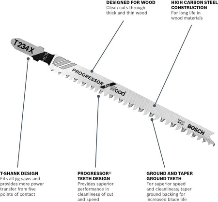 Bosch Progressor for Wood blades offer fast, clean cuts through wood and wood products. Patented progressive tooth design produces fast cuts and long life in thick and thin materials. T-shank design for maximum grip and stability which fits 90% of all current jig saw makes and models.