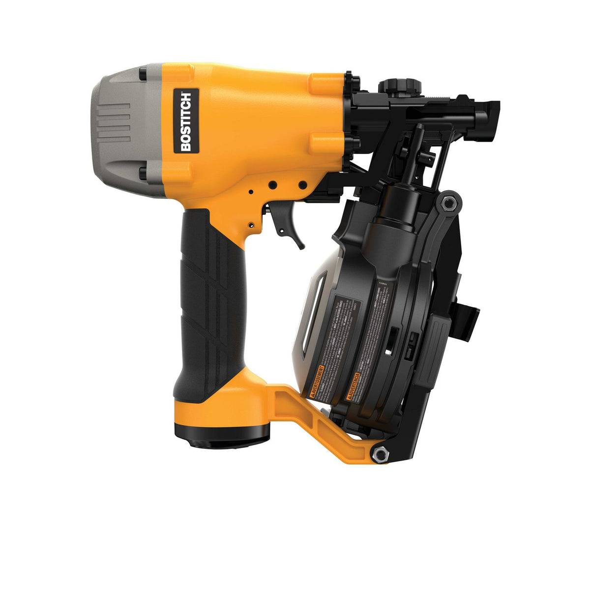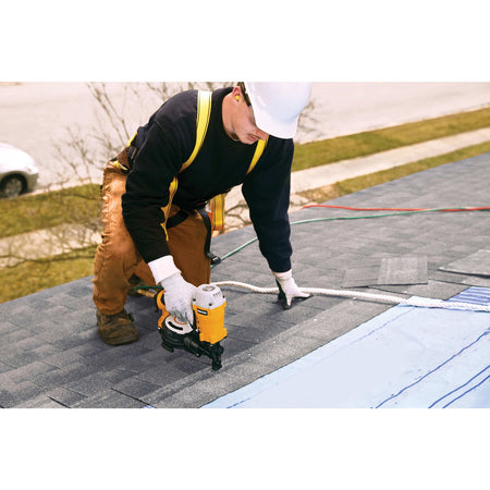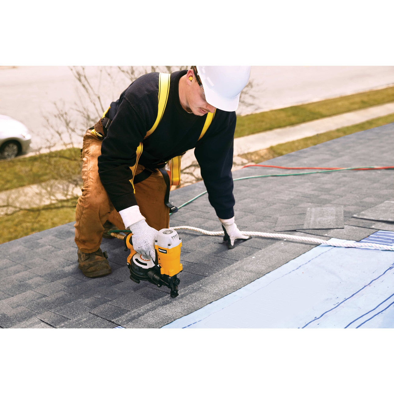 This 15-Degree Pneumatic Coil Roofing Nailer features an upgraded engine and feed system that improves drive quality, nail handling, and overall performance. At just 5.3 lbs., this powerful roofing nailer drives nails from 3/4 to 1-3/4-inch A convenient depth adjustment wheel makes it easy to properly install fasteners into a variety of materials. The redesigned overmold grip makes this roofing nail gun comfortable to work with this tool all day.