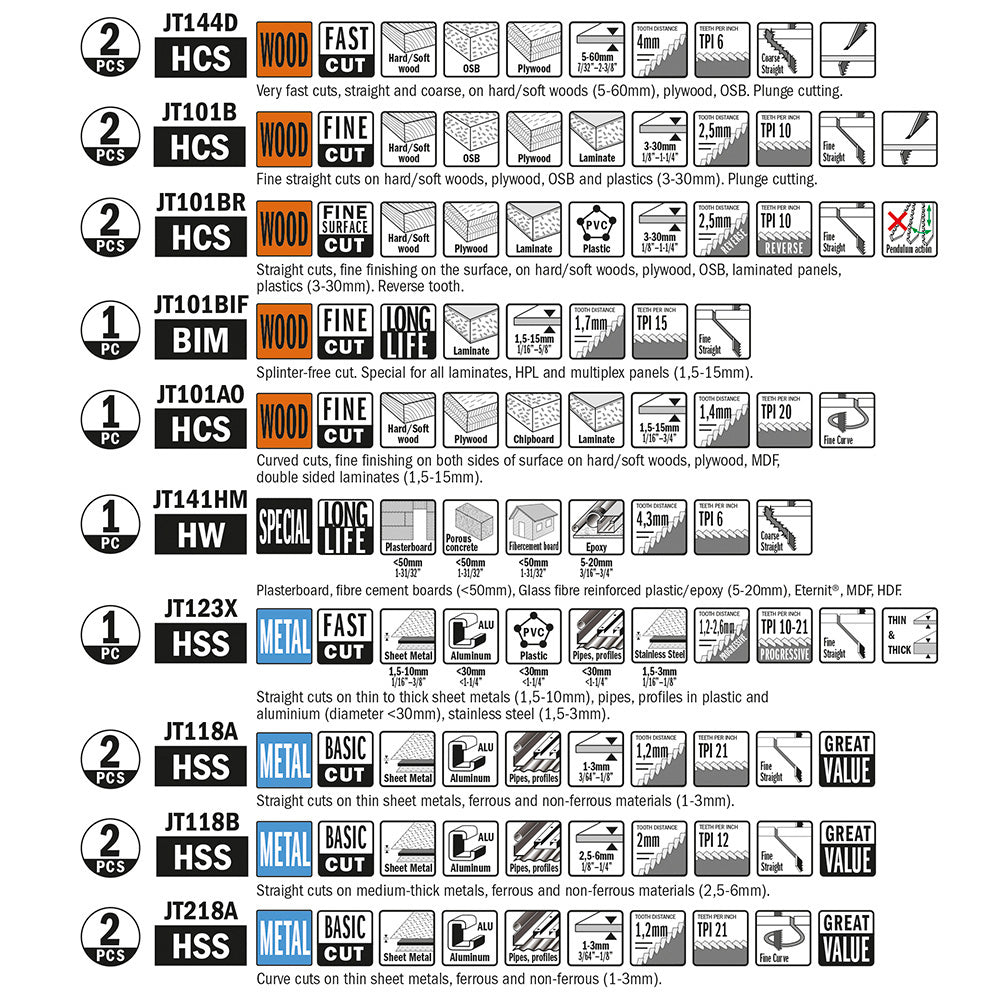 The CMT Jig Saw Blade 16 piece Assortment contains 16 Jig Saw Blades featuring the 10 most popular blades for a variety of cutting needs:
