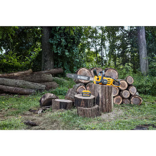 Cut, chop, and sculpt with ease using the durable 60V MAX Brushless Cordless 20 in. Chainsaw. With a peak horsepower of 4 HP using a DCB615 battery (sold separately), this rugged Chainsaw packs the sawing power and dependability needed for routine sunup to sundown workdays. Tighten the chain as needed for steady bar retention while the brushless motor delivers high-efficiency performance with auto-oiling for continuous lubrication. Kick back protection is provided by the chain brake bult-in with the low kick back bar and chain.