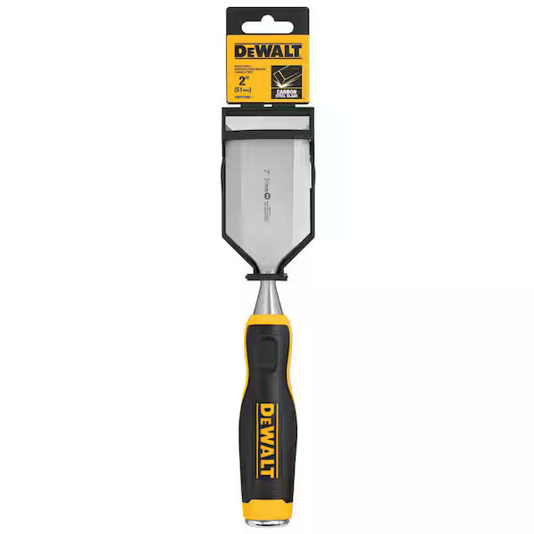 The DEWALT 2 in. wood chisel is designed with the professional in mind. The handle is ergonomically constructed for comfort, with a durable metal cap for striking and driving the chisel blade. The carbon steel blade is tempered and hardened to ensure a long-lasting edge and lacquered to protect against corrosion.