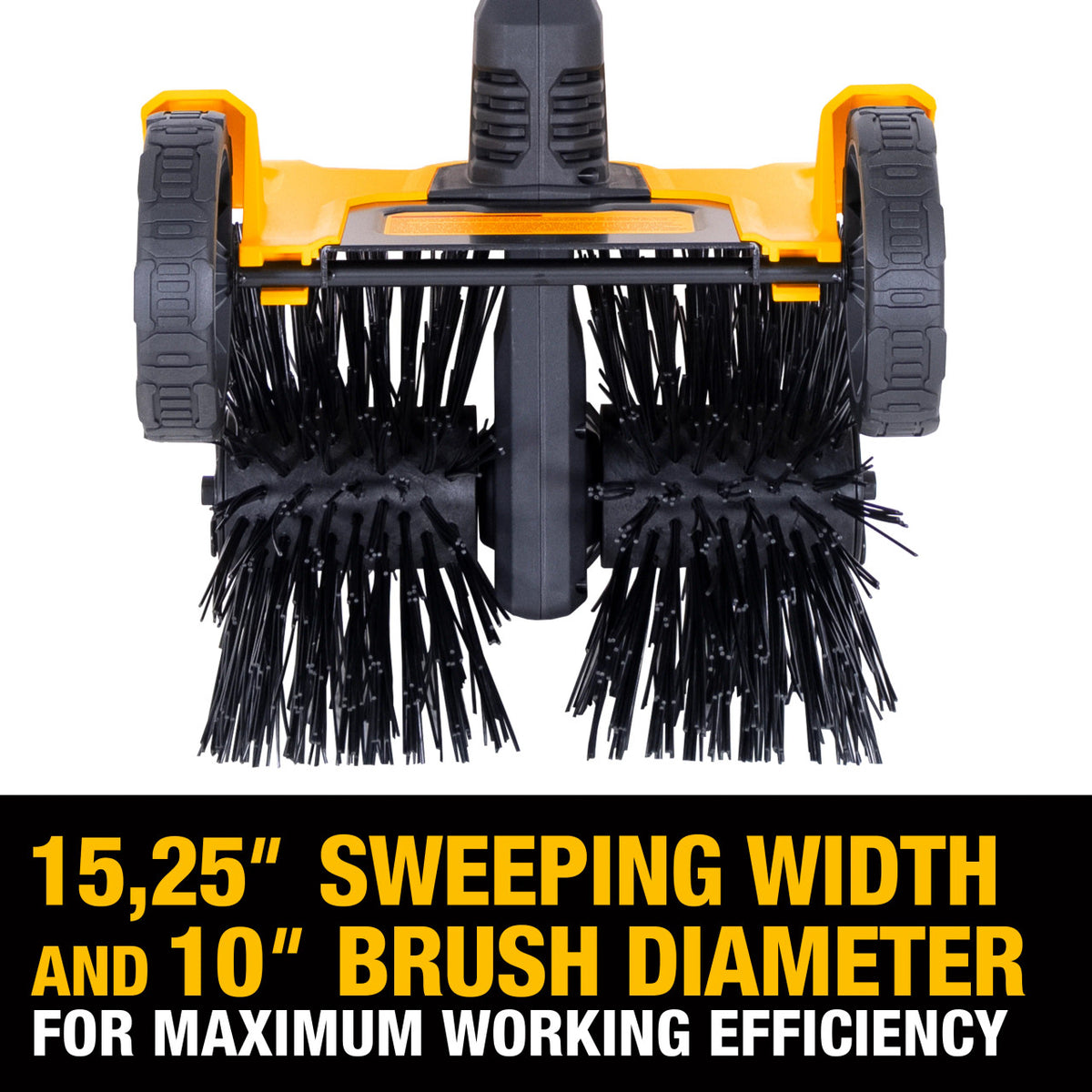 The DEWALT Sweeper Tool Only is built to power through landscaping's toughest jobs. With a robust brushless motor and compatibility with 20V DEWALT batteries (sold separately), it's engineered for relentless performance. Featuring 3-speed control, a 10" diameter, and a 6.5" bristle length it's built tough to handle any clearing task efficiently. Plus, with up to 20 minutes of maximum working time, you can trust DEWALT toughness to get the job done.