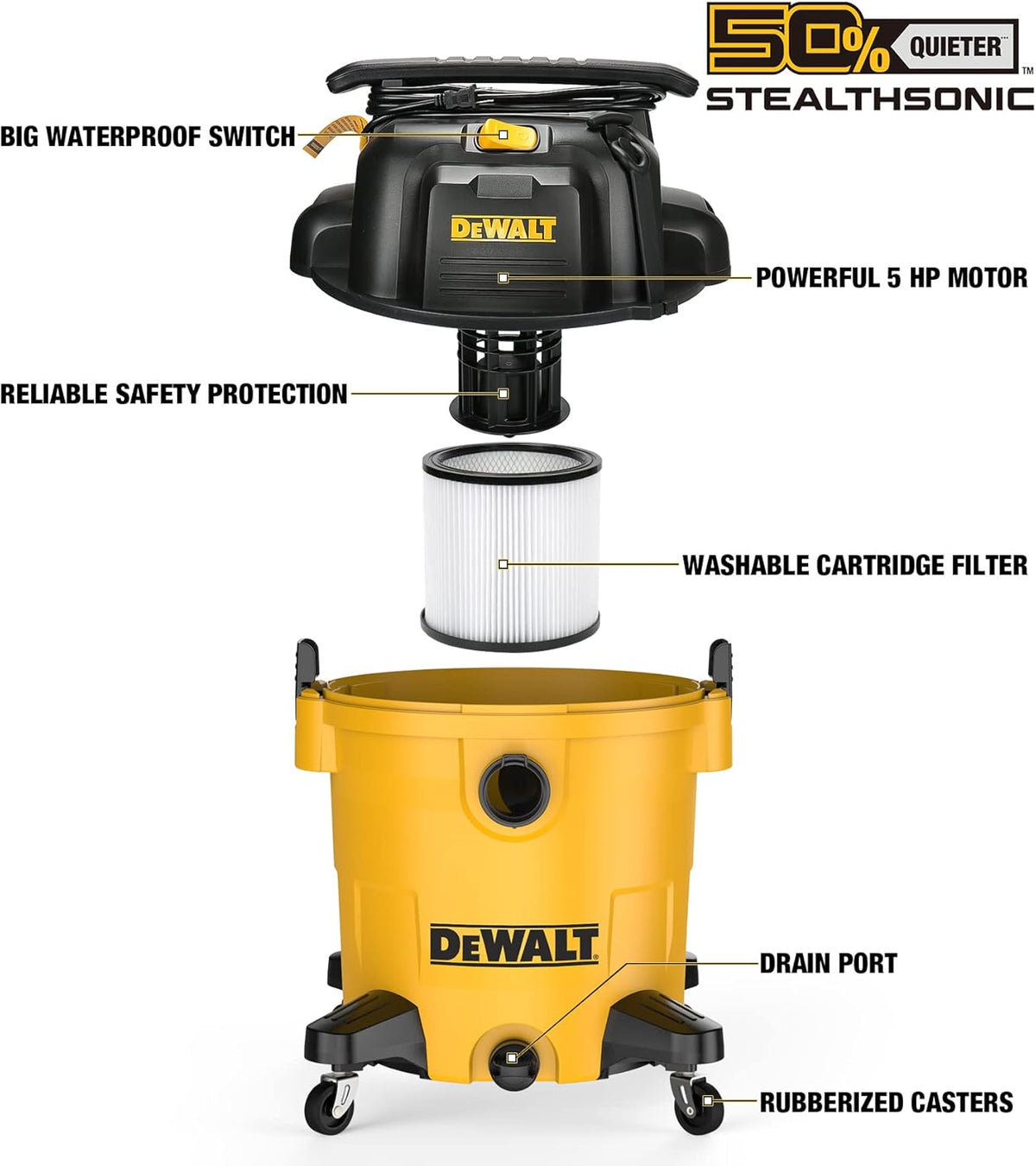 - 【New QUIET TECHNOLOGY】The DEWALT 16 Gallon. DXV16P-QTA Poly Wet Dry Vacuum has a powerful quiet motor providing strong suction power and airflow to clean up the toughest wet and dry messes while being 50% quieter than the current model.