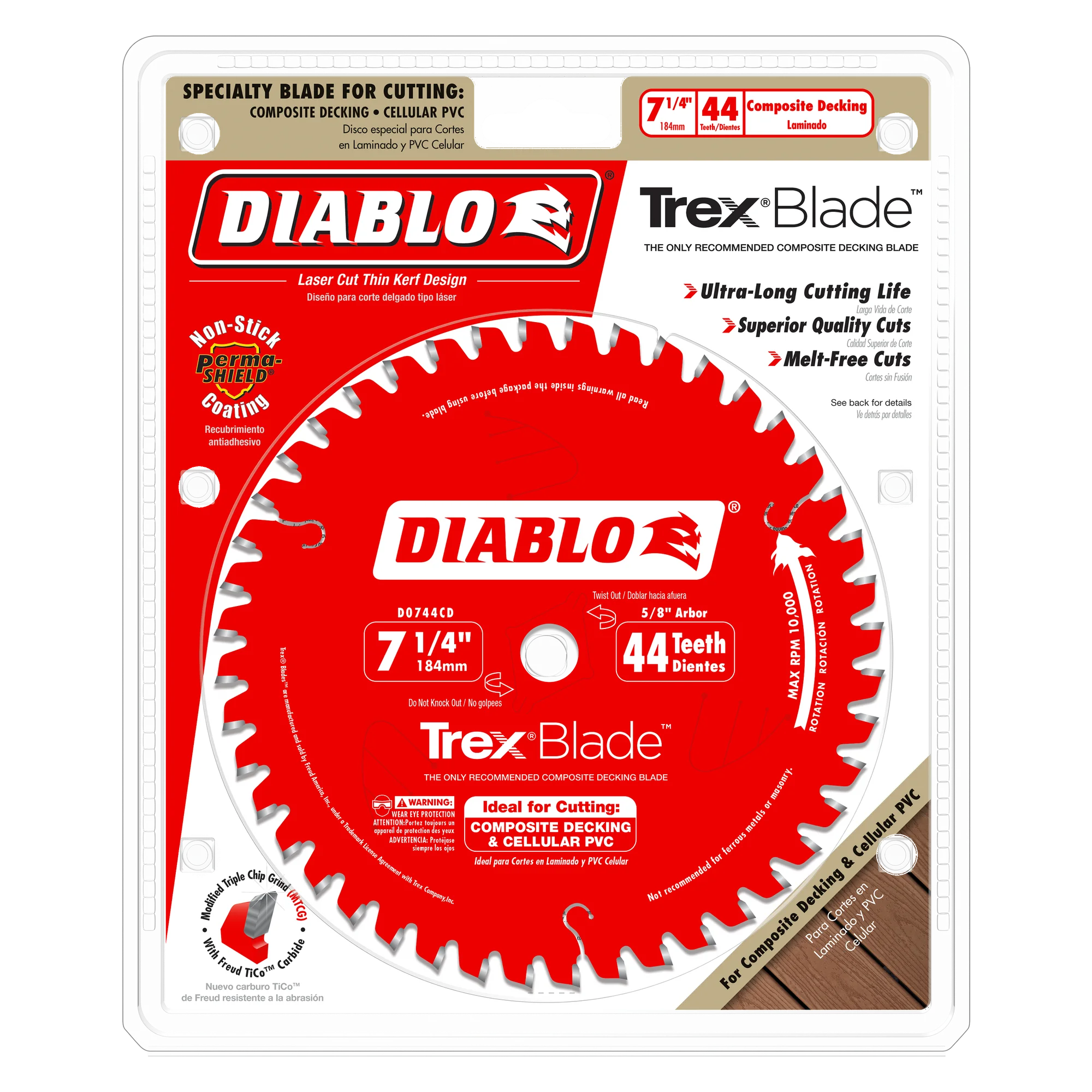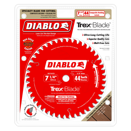 Diablo's TrexBlade™ Saw Blade for Composites and Plastic is the only blade recommended by Trex Company for cutting their composite decking materials. These new blades deliver maximum performance and highest quality of finish; making it a ‘must-have’ tool for both professionals and DIYers planning composite decking projects. Diablo's new saw blade series has a modified triple chip tooth grind design, Perma-SHIELD® non-stick coating, and specific TiCo™ Hi-Density carbide to deliver more efficient and cleaner cuts with no swirl marks, less “gumming” of blade teeth and longer cutting life .