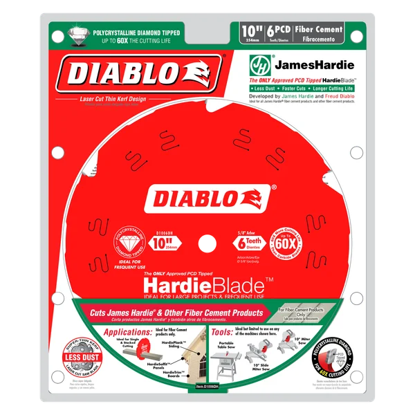 Diablo's HardieBlade™ Saw Blade for Fiber Cement recommended by James Hardie Building Products. Diablo Fiber Cement Blades generate up to 50% less respirable dust*, while delivering the longest life in all fiber cement materials. Diablo's polycrystalline diamond (PCD) blades feature a unique, spark-eroded Triple Chip grind for up to 75X the life of conventional carbide blades. Diablo's HardieBlade™ Saw Blades are perfect for full-time use in heavy duty applications like cutting multiple pieces of fiber cement board. * Dust generation does not necessarily correlate directly to exposure risk.