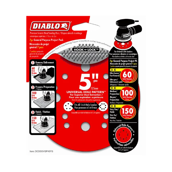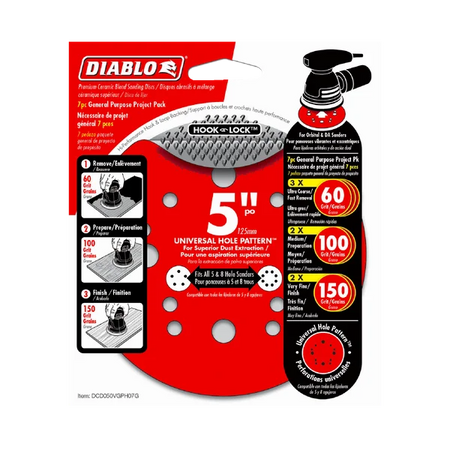 Diablo's premium 7-piece General Purpose Hook & Lock™ ROS Sanding Disc Pack includes all the grits needed to complete your refinishing project. This project pack contains three 60-Grit, two 100-Grit, and two 150-Grit discs. These universal, 12-hole random orbital sanding (ROS) discs feature Hook & Lock™ backing and includes break-through innovations that improve performance, extend sanding life and increase productivity. Featuring a premium ceramic blend, these discs remove material faster than other sanding discs and offer an extra long sanding life. Clog-SHIELD, Diablo's own blend of grinding agents, reduces loading thus maximizing productivity. The superior grit-to-backing bond, ENDURA-BOND, provides Diablo's sanding discs with longer life and extreme durability.