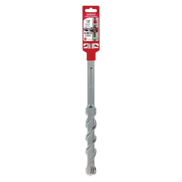 Diablo’s revolutionary, most complete range of SDS-Plus and SDS-Max Rebar Demon™ 4-cutter full-carbide head hammer drill bits are the only bits designed to be the most durable, fastest and coolest solutions on the market. The Rebar Demon bits feature up to 2X more Dura-Carbide to withstand up to 1800°F of intense heat whereas standard bits fail at 800°F. Diablo’s impact resistant 4-cutter full-carbide head withstands the stress of high-powered hammer drills and the impact of rebar by taking small bites of rebar to deliver controlled carbide wear, reduced vibration and up to 7X longer life. Produced with Tri-Metal Fusion Welding, the full-carbide head resists heat and prevents breakage in extreme impact situations. Precision Tip delivers the stability and accuracy required to produce fast, precise holes in reinforced concrete for anchor setting.
