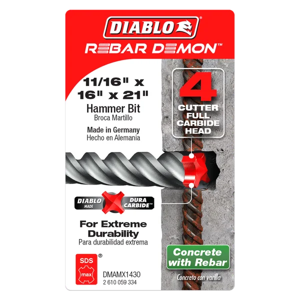 - Diablo made Dura-Carbide™ features up to 2X more carbide that withstands up to 1800°F of intense heat to combat rebar hits versus standard bits that fail at 800°F