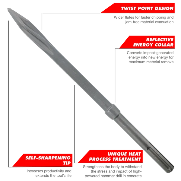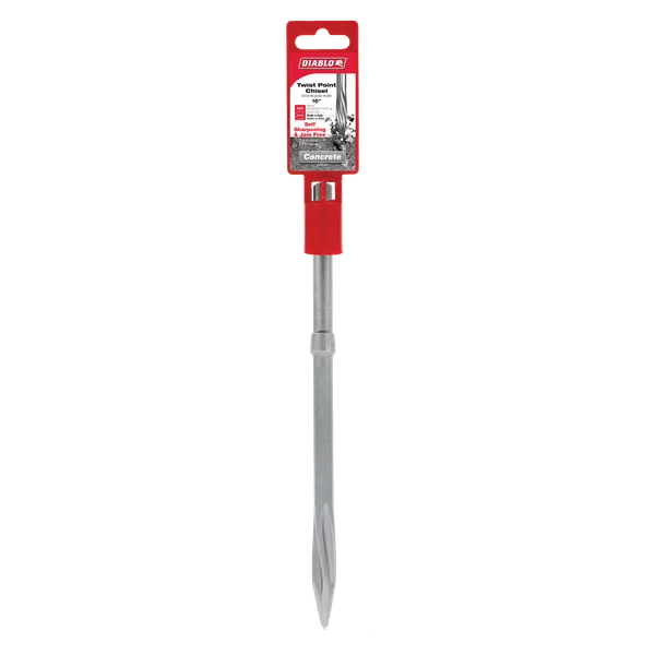 Diablo’s SDS-Plus and SDS-Max Twist Point Chisels deliver extreme durability and stability in general demolition work and clearing reinforcements. The reflective energy collar converts impact-generated energy into new energy for maximum material removal. A unique heat treatment process strengthens the steel body to withstand the stress and impact of high-powered hammer drills. The Twist Point design provides wider flutes for faster chipping and jam-free material evacuation. Self-sharpening tip increases productivity and extends the tools life. Optimized for maximum performance in corded and cordless SDS-Plus and SDS-Max rotary hammers.